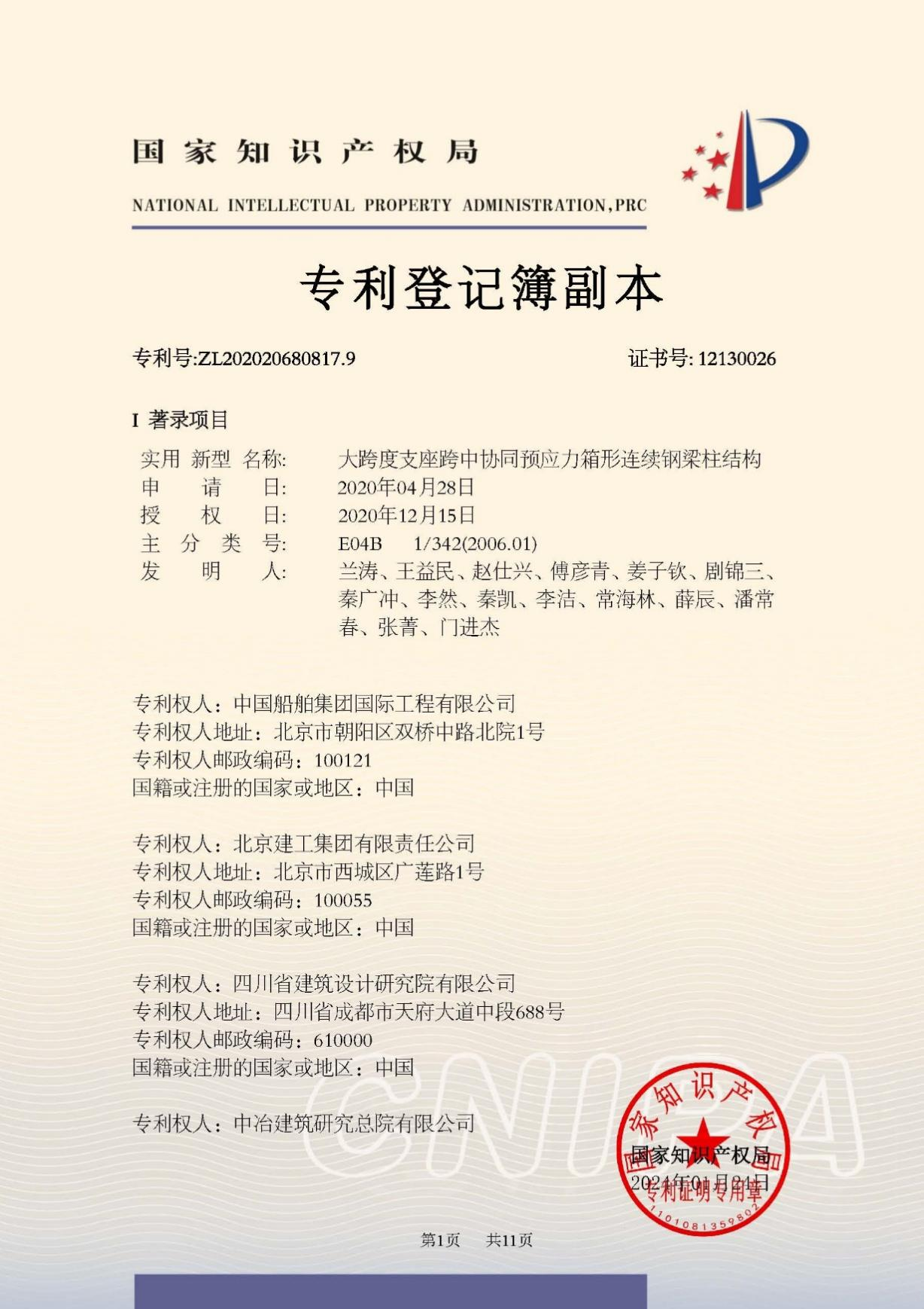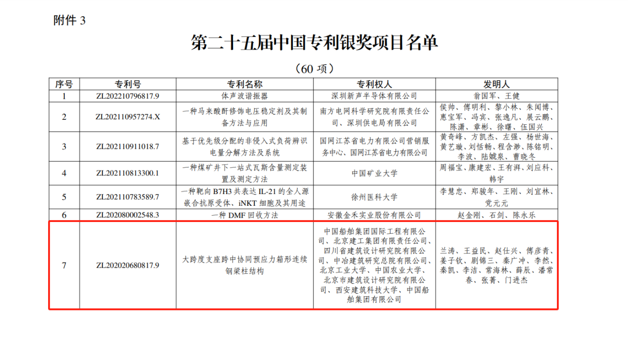 今年6月,國家知識產(chǎn)權(quán)局公布第二十五屆中國專利獎授獎決定,由中船集團旗下中船國際工程主導(dǎo)申報的專利《大跨度支座跨中協(xié)同預(yù)應(yīng)力箱形連續(xù)鋼梁柱結(jié)構(gòu)》(專利號:ZL202020680817.9)榮獲本屆中國專利銀獎。該獎項由國家知識產(chǎn)權(quán)局與世界知識產(chǎn)權(quán)組織聯(lián)合設(shè)立,是我國專利領(lǐng)域的最高榮譽。今天,讓我們走進中船國際工程鋼結(jié)構(gòu)工程設(shè)計與研發(fā)團隊,聆聽他們的奮斗故事。